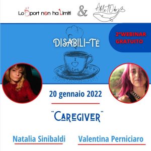 Disabili-tè : Caregiver20 gen 2022 - Webinar OnlineNuovo appuntamento di Disabili-tè : un dialogo sui caregiver tra Natalia Sinibaldi e Valentina Perniciaro, con Paola D'AngeloScopri di piùLeggi la locandina originale