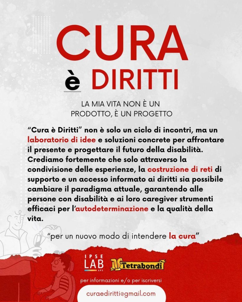 Dopo la pausa estiva, si ricomincia con il ciclo di incontri del progetto ‘Cura è diritti’ ideato da Ipse Lab e Tetrabondi ETS. “LA MIA VITA NON È UN PRODOTTO, È UN PROGETTO” “Cura è diritti” è un gruppo di lavoro per persone con disabilità, caregivers, operatori e chiunque sia interessato ad approfondire la tematica del Progetto di vita, della cura, dell’assistenza, affrontare il presente e progettare il futuro della disabilità. L’obiettivo è condividere informazioni, cercare insieme risposte, fare rete, costruire conoscenza condivisa: È costruire insieme un percorso. Crediamo fortemente che solo attraverso la condivisione delle esperienze, la costruzione di reti di supporto e un accesso informato ai diritti sia possibile cambiare il paradigma attuale, garantendo alle persone con disabilità e ai loro caregiver strumenti efficaci per l’autodeterminazione e la qualità della vita.
