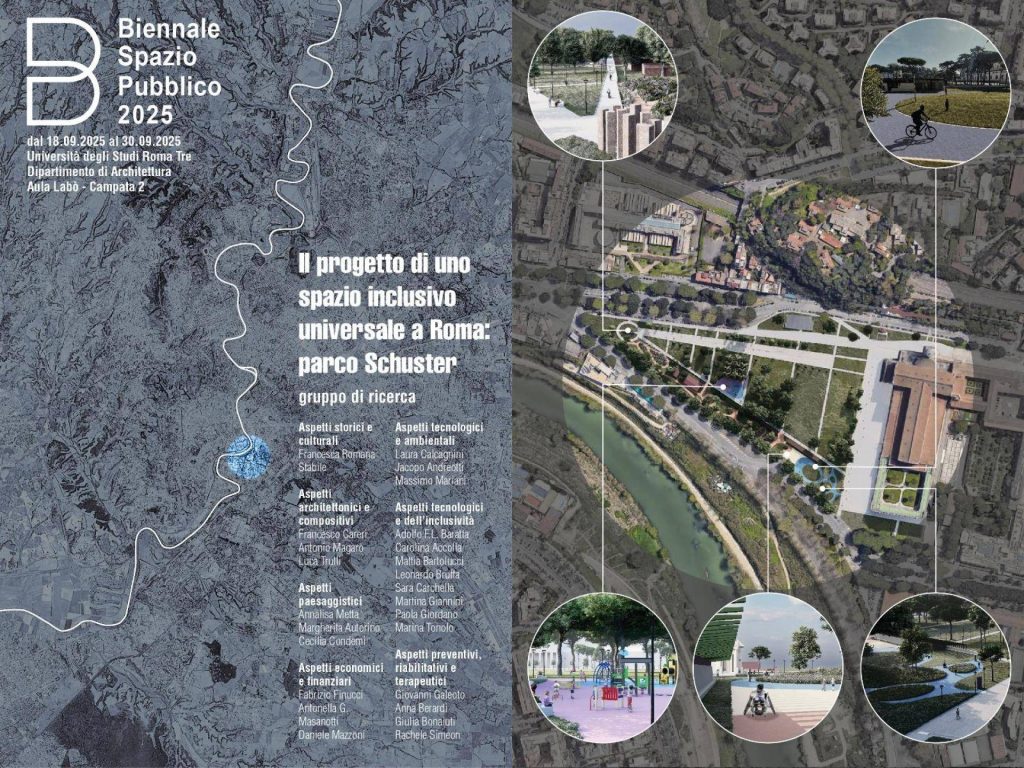 Il progetto di ricerca del Parco inclusivo Universale Schuster è esposto alla Biennale dello Spazio Pubblico (BiSP). La BiSP è un evento dedicato al confronto e alla diffusione di esperienze, ricerche e pratiche legate agli spazi pubblici urbani, quali luoghi che rappresentano valori di civiltà, inclusione e partecipazione, contribuendo a definirne l’identità. L’evento è ospitato dal Dipartimento di Architettura dell’Università Roma Tre, nella sede dell’ex Mattatoio dal 18 al 20 settembre. L’esposizione della ricerca, dal titolo “Uno Spazio inclusivo Universale a Roma. Parco Schuster”, a cura di Adolfo F.L. Baratta, Laura Calcagnini, Francesco Careri, Fabrizio Finucci, Annalisa Metta, e Francesca Romana Stabile, sarà in aula Labò, Campata 2, fino al 30 settembre. Hanno collaborato all’istallazione dell’esposizione Antonio Magarò, Antonella G. Masanotti, Daniele Mazzoni, Luca Trulli e Marina Tonolo.