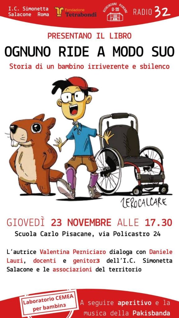 DocentÉœ e genitorÉœ dell’ Istituto Comprensivo Simonetta Salacone, insieme a Pisacane 099, @Radio 32 e la Fondazione Tetrabondi presentano il libro Ognuno ride a modo suo. Storia di un bambino irriverente e sbilenco, giovedì 23 novembre alle ore 17.30, presso la Scuola Carlo Pisacane. Intervengono l’autrice Valentina Perniciaro, Daniele Lauri, genitorÉœ e docentÉœ. A seguire aperitivo a sottoscrizione e la musica della Pakisbanda / Πακισμπαντα. Animazione del CEMEA del Mezzogiorno per le bambine e i bambini.