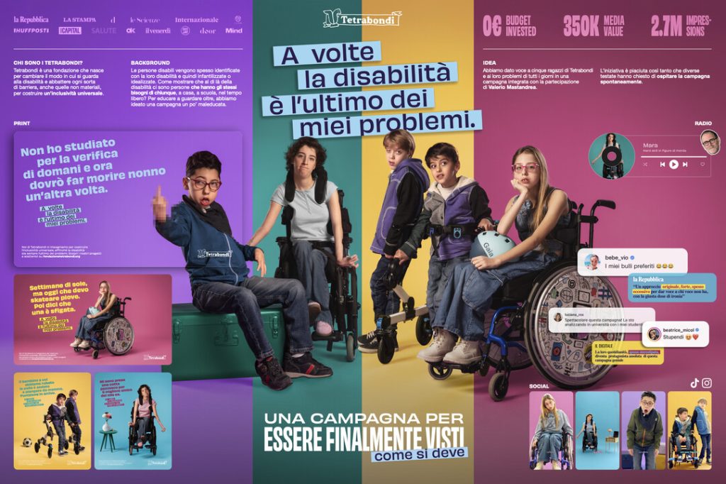 Meglio la parola Tetrabondi, per dire tetraplegici e vagabondi, per superare il pietismo insopportabile legato alla disabilità. Fuori dagli stereotipi dei “bambini speciali”, una Campagna originale, forte, anche eccessiva sceglie così di dar voce a chi voce non ha, con la giusta dose di ironia e irriverenza. Sirio, Gaia, Mara, Oly e Theo – storti, sbilenchi, sordi, ipovedenti – sono solo un piccolo pezzettino di un esercito sgangherato e irriverente di corpi e menti non conformi, che vuole riappropriarsi del diritto di raccontarsi per quello che è, al di là della disabilità.