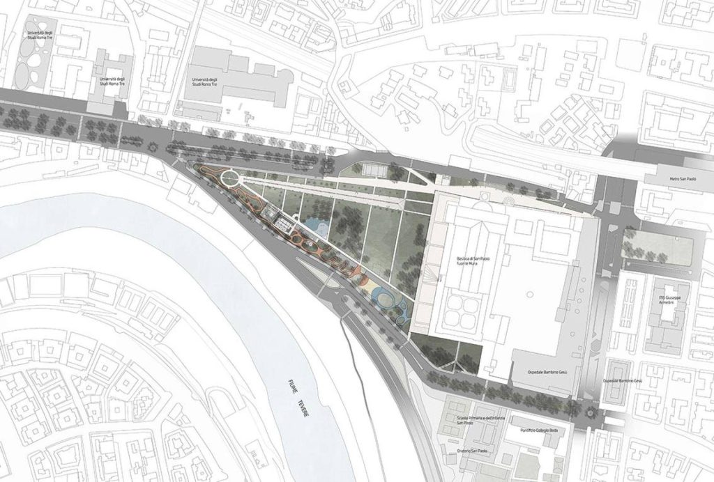 La stessa basilica di San Paolo risulta recintata lungo tutto il suo perimetro, ostacolando la ricerca, insista nel progetto, di una connessione tra la sfera ecclesiastica e quella pubblica del parco. I resti archeologici, che nel progetto degli architetti Cellini e Cipollone si inserivano nell’elaborazione di una più ampia area pedonale, sono oggi chiusi da una cancellata, che ne impedisce accessibilità e fruizione.
